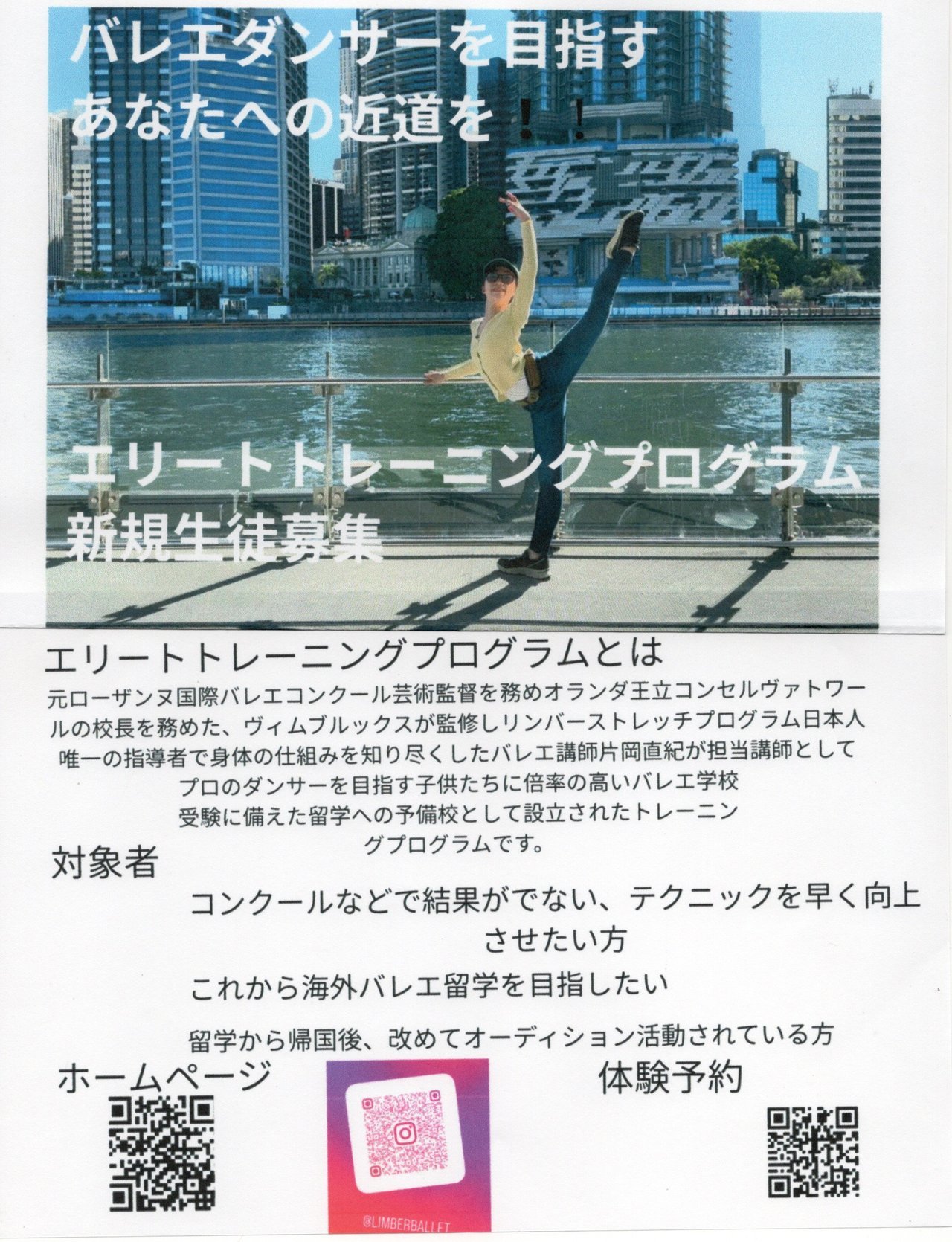 エリートトレーニングプログラムとは元ローザンヌ国際バレエコンクール芸術監督を務めオランダ王立コンセルヴァトワールの校長を務めた、ヴィムブルックスが監修しリンバーストレッチプログラム日本人唯一の指導者で身体の仕組みを知り尽くしたバレエ講師片岡直紀が担当講師として