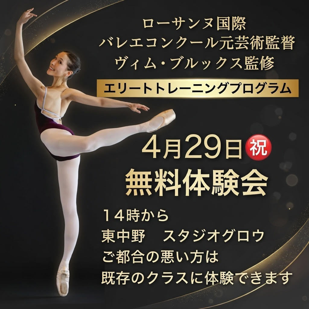 エリートトレーニングプログラムとは元ローザンヌ国際バレエコンクール芸術監督を務めオランダ王立コンセルヴァトワールの校長を務めた、ヴィムブルックスが監修しリンバーストレッチプログラム日本人唯一の指導者で身体の仕組みを知り尽くしたバレエ講師片岡直紀が担当講師として